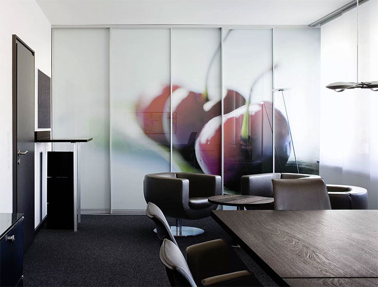 Противопожарные перегородки с фотопечатью могут изготавливаться как в полностью остекленном варианте, так и в частично остекленном исполнении. Основное предназначение таких конструкций — это разделение общего помещения на несколько отдельных рабочих зон. При этом преследуется несколько целей: